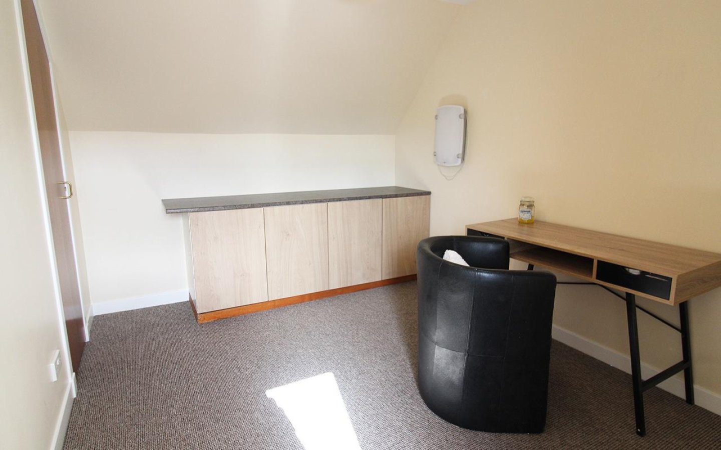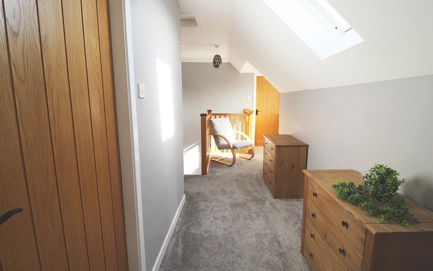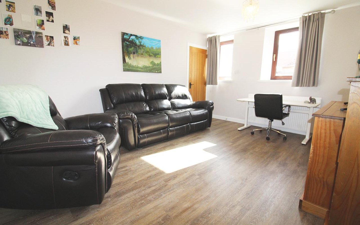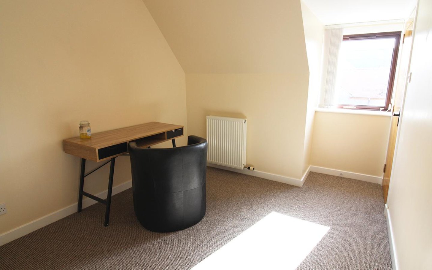 The oak staircase is fitted with a grey carpet which continues up to the large landing which accesses the further two bedroom, bathroom and a large storage cupboard. The landing has windows over the front of the property making it a bright space. Bedroom 2 is a large double which has a window and a large built-in cupboard and fitted carpet. Bedroom 3 also overlooks the front and has been utilized as a office. As well as a large built-in storage cupboard there are also cupboards under a worktop area and the room is finished with a fitted carpet.