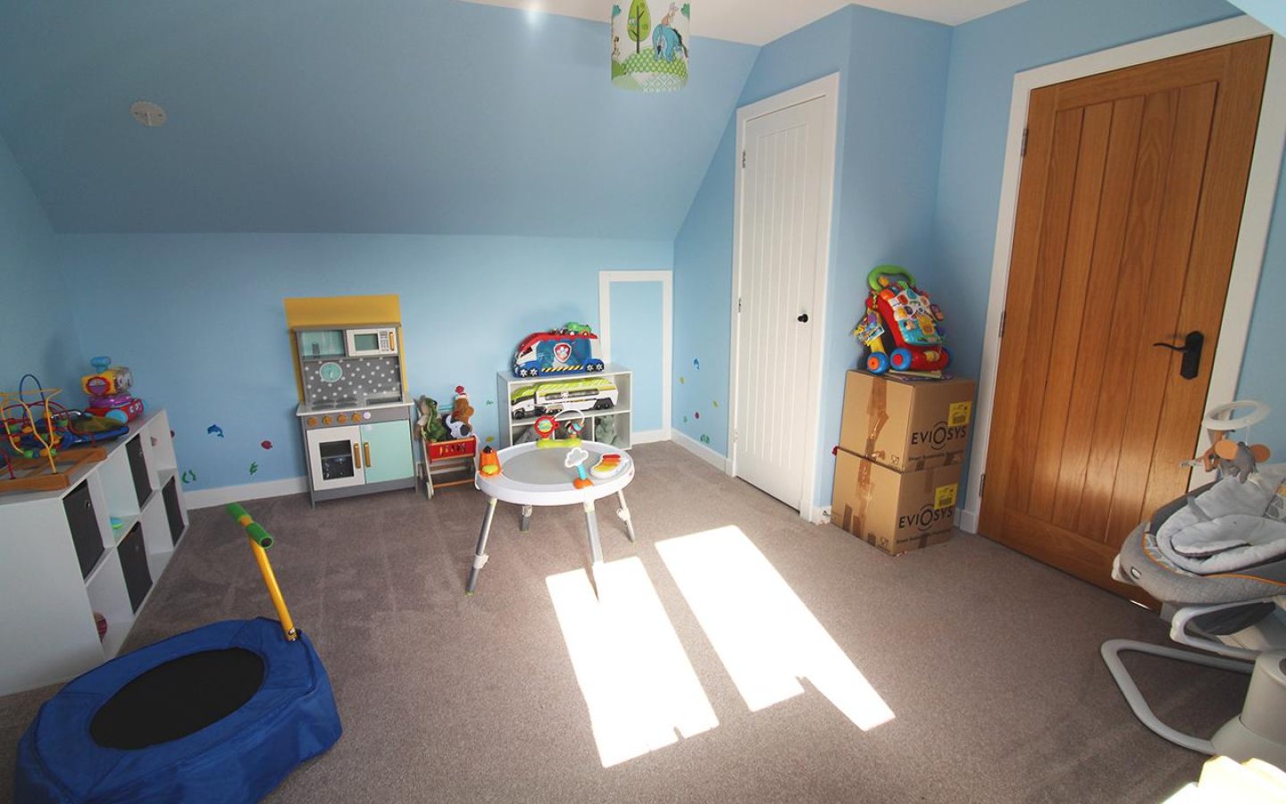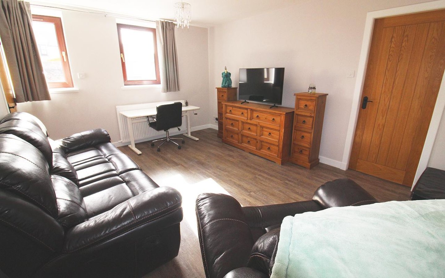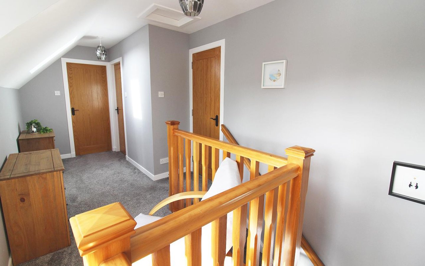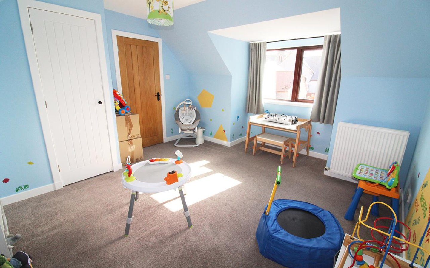 The oak staircase is fitted with a grey carpet which continues up to the large landing which accesses the further two bedroom, bathroom and a large storage cupboard. The landing has windows over the front of the property making it a bright space. Bedroom 2 is a large double which has a window and a large built-in cupboard and fitted carpet. Bedroom 3 also overlooks the front and has been utilized as a office. As well as a large built-in storage cupboard there are also cupboards under a worktop area and the room is finished with a fitted carpet.