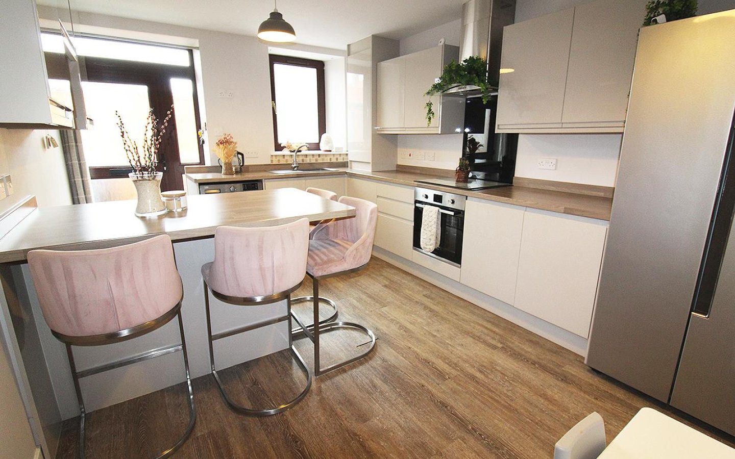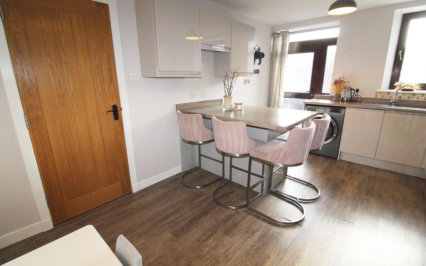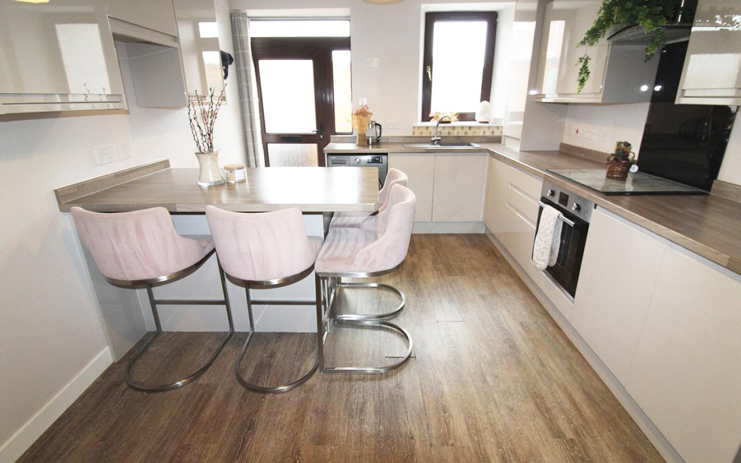 The dining kitchen is fitted with a modern gloss handless kitchen with a good selection of base and wall mounted units with contrasting worktop, upstands and breakfast bar. Integrated appliances consist of an electric oven and hob with extractor above and a slimline dishwasher. There is space within the kitchen for a washing machine, tumble and fridge/freezer. Sink with drainer and mixer tap sits below the window overlooking the garden which is accessed via a glazed uPVC door.