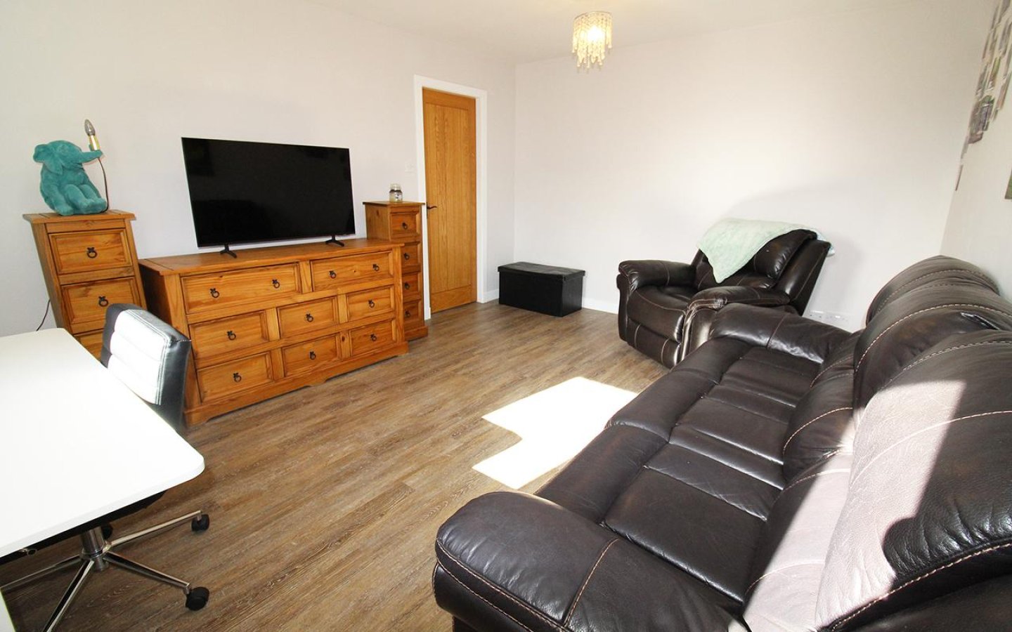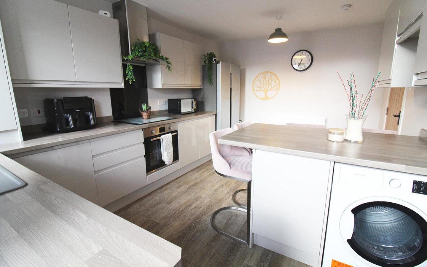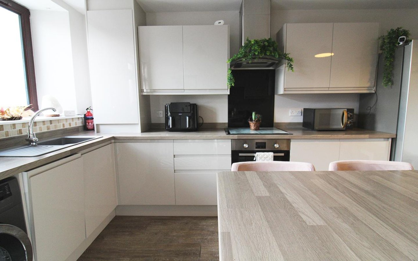 The dining kitchen is fitted with a modern gloss handless kitchen with a good selection of base and wall mounted units with contrasting worktop, upstands and breakfast bar. Integrated appliances consist of an electric oven and hob with extractor above and a slimline dishwasher. There is space within the kitchen for a washing machine, tumble and fridge/freezer. Sink with drainer and mixer tap sits below the window overlooking the garden which is accessed via a glazed uPVC door.