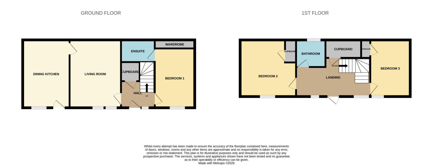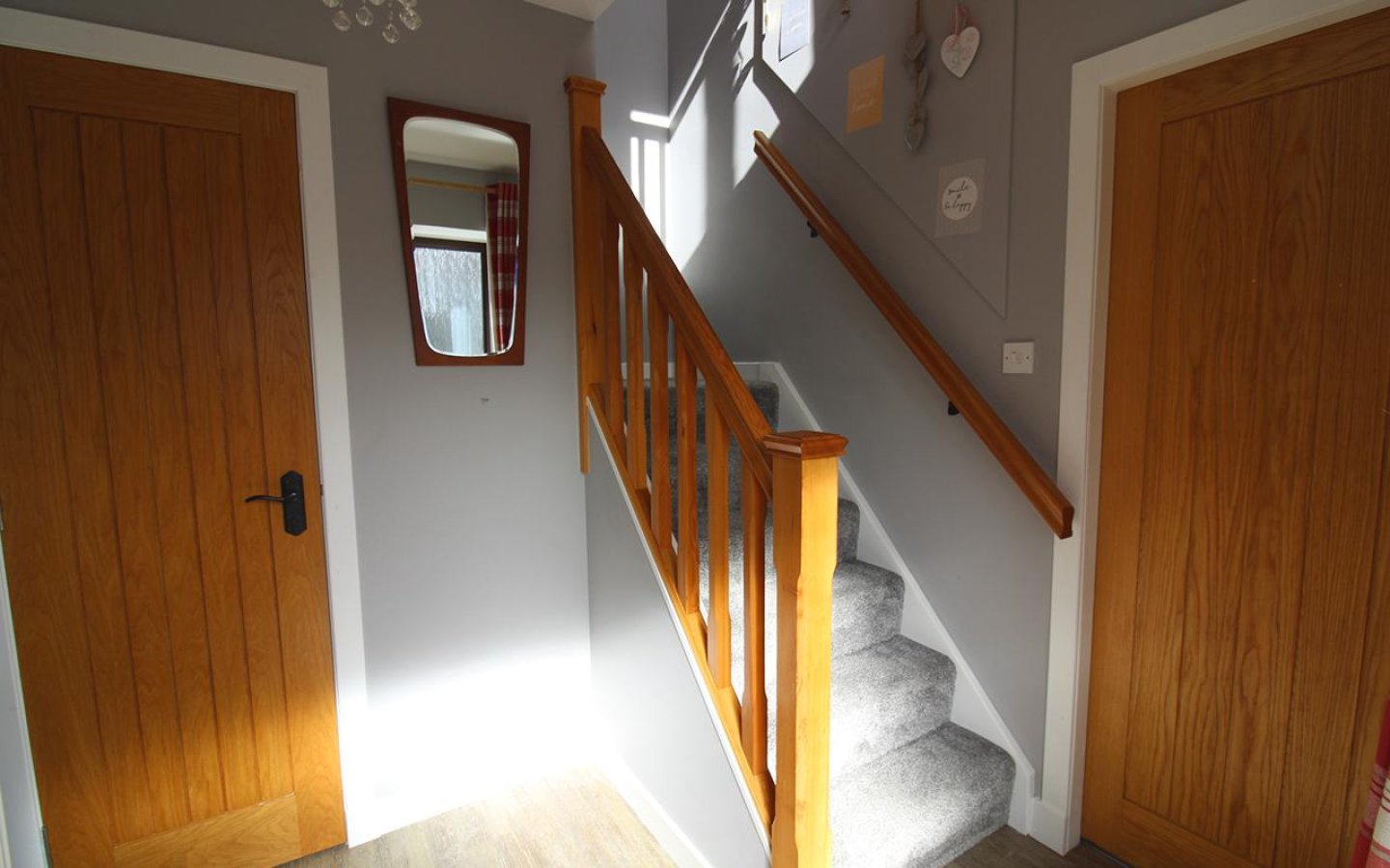 The property is accessed via a uPVC door with glazed side screen into the hall which accesses the living room, ground floor bedroom and the carpeted staircase to the first floor and a large storage cupboard. The wood effect laminate from the hall continues into the living room, which is a lovely bright room with two windows to the front. The living room is decorated in neutral tones and has door leading into the dining kitchen.