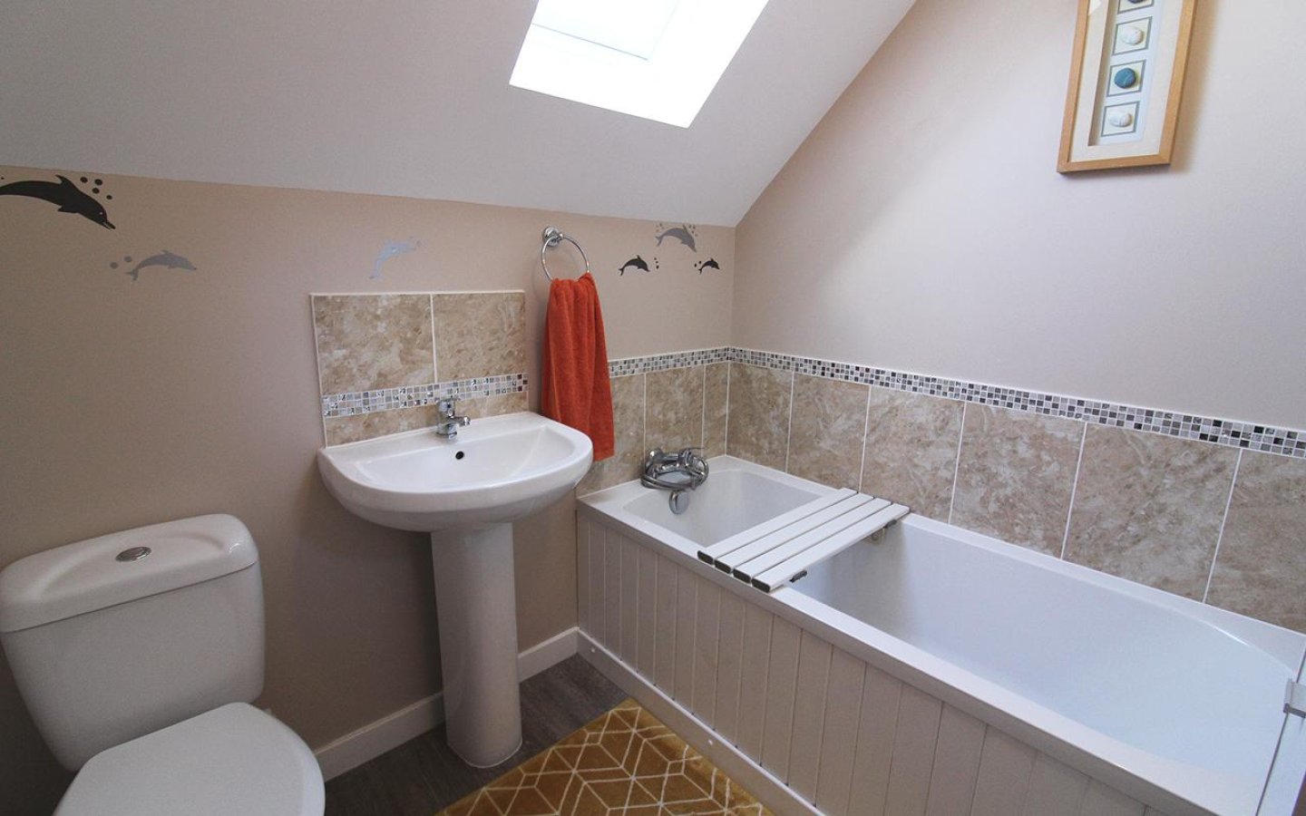 The bathroom is fitted with a white suite consisting a w.c, handbasin and bath with tiling around the bath. The bathroom has a roof window to the rear, vinyl flooring and the usual bathroom accessories.