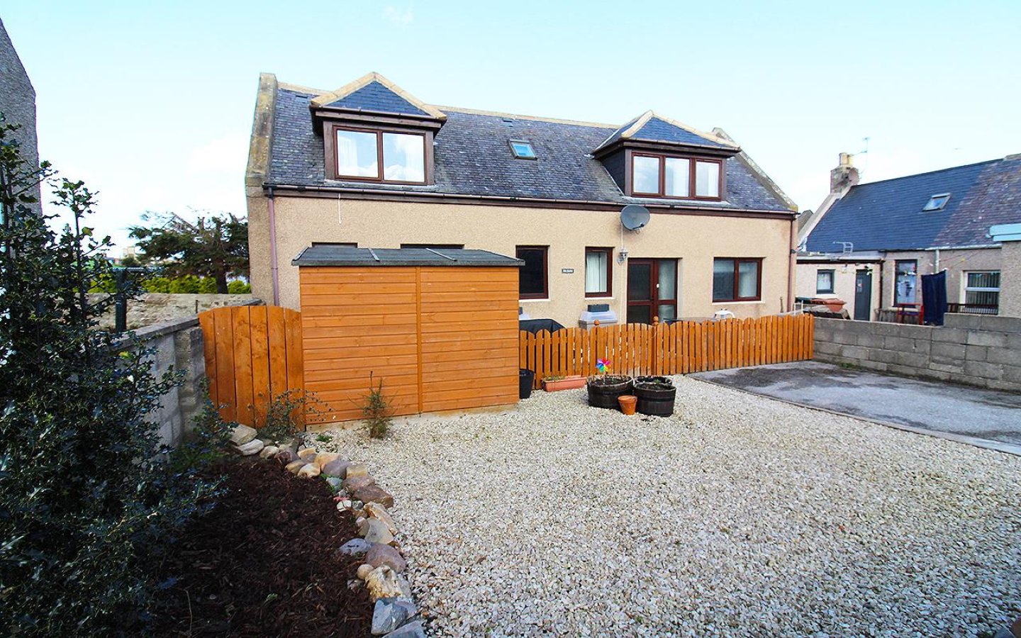 The garden is south facing and a wonderful sun trap, it is laid mainly to stone chip for ease of maintenance with a border area for planting. A wooden shed offers garden storage and there is also an outside tap. A concrete drive offers parking.